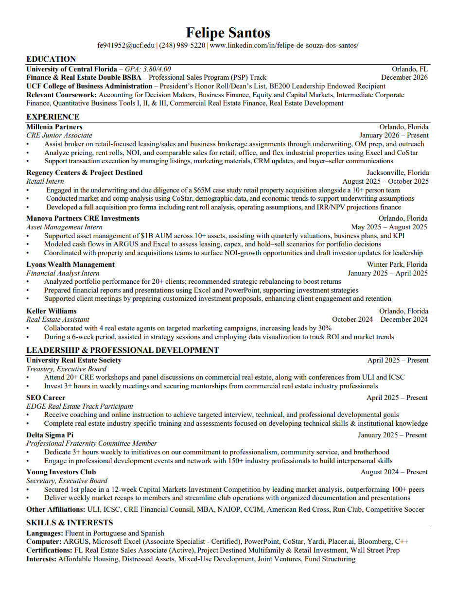 I’m a fist-gen Brazilian American finishing my BSBA in Real Estate with a dual minor in Professional Sales and Finance at University of Central Florida.